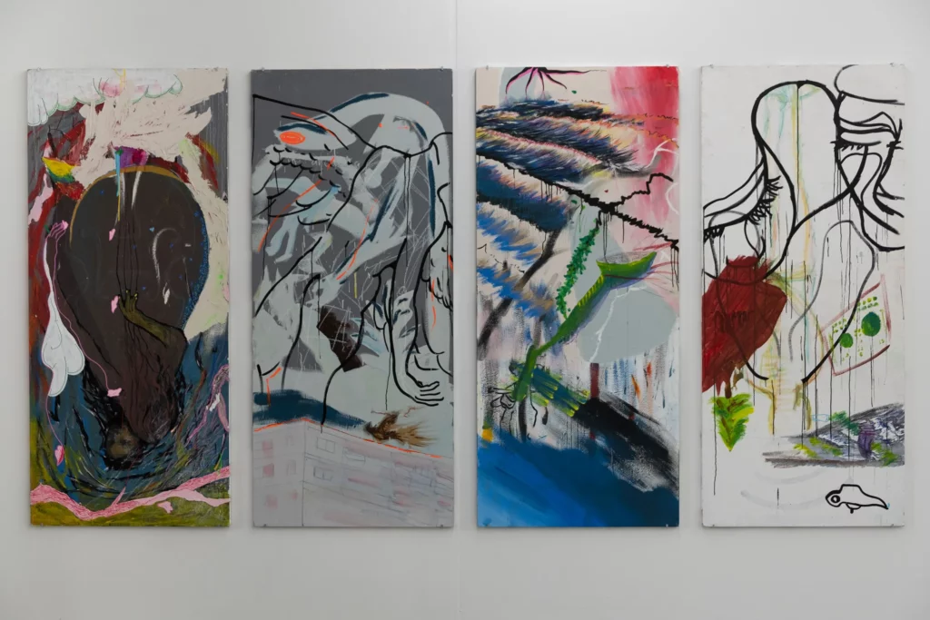 "Sans titre" (projet planches) - 90x200cmx4 -2023 "Sur la route" - acrylique et encre sur toile - 15x15cm - 2024 "Sans titre" (projet planches) - acrylique et encre sur bois - 90x200cm - 2020 "Sans titre" (projet planches) - acrylique et encre sur bois - 90x200cm - 2021 "To the sea" - Pastels à l'huile et huile sur toile - 30x50cm - 2025 "L'autre joue" - Encre et huile sur toile - 50x70cm - 2026 "Fin d'automne" - Huile et encre sur toile - 40x30cm - 2026 "Danse avec moi" - Encre et huile sur toile - 50x100cm - 2025